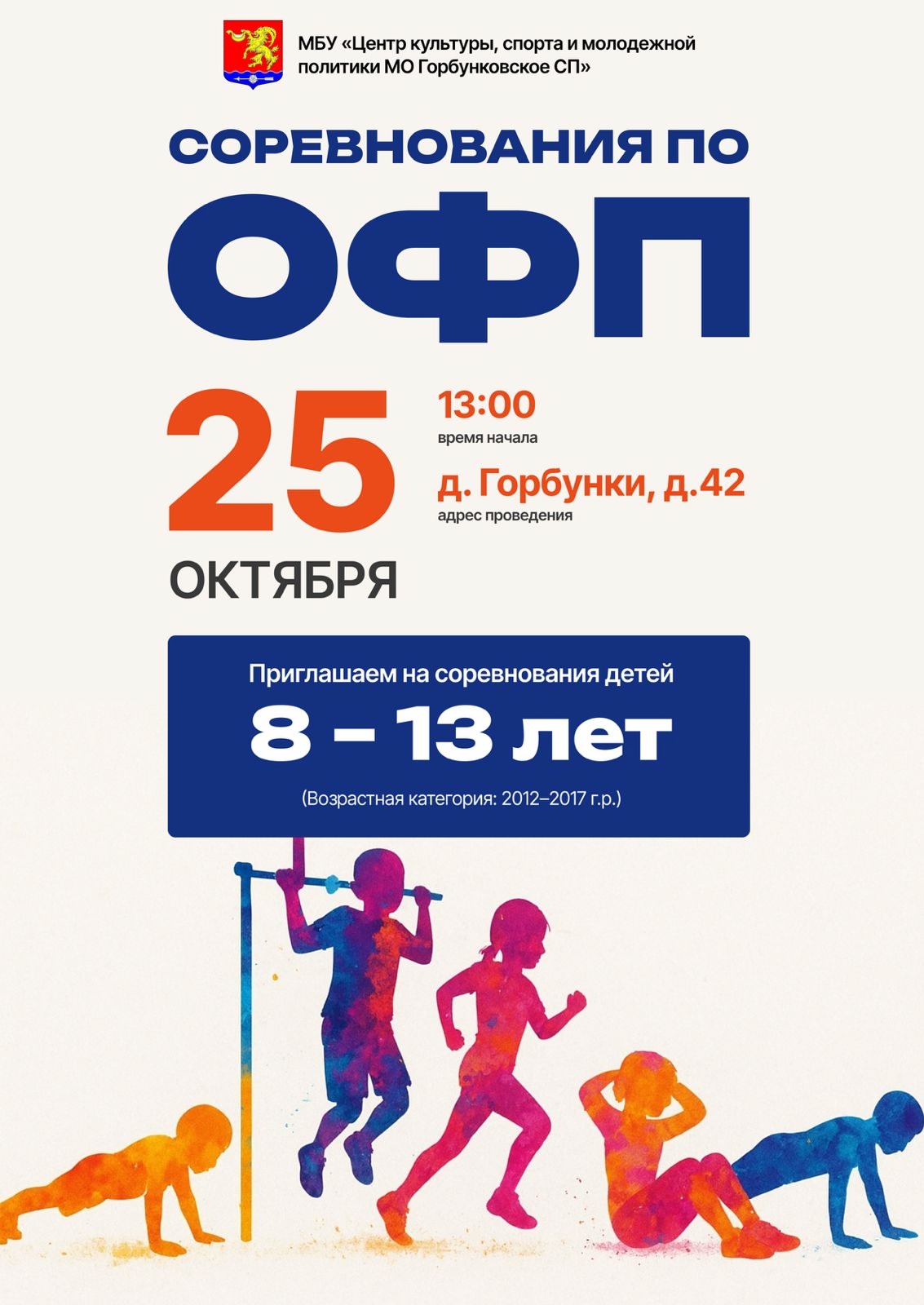 25 октября в 13:00 по адресу: д. Горбунки, д. 42 пройдёт яркое спортивное событие для детей 8-13 лет (2012-2017 г.р.).